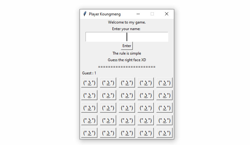 Guess The Face is a small game project I made in around 2019. I used it to demonstrate my Python programming skills. It uses Tkinter for user interface and winsound to play sound.